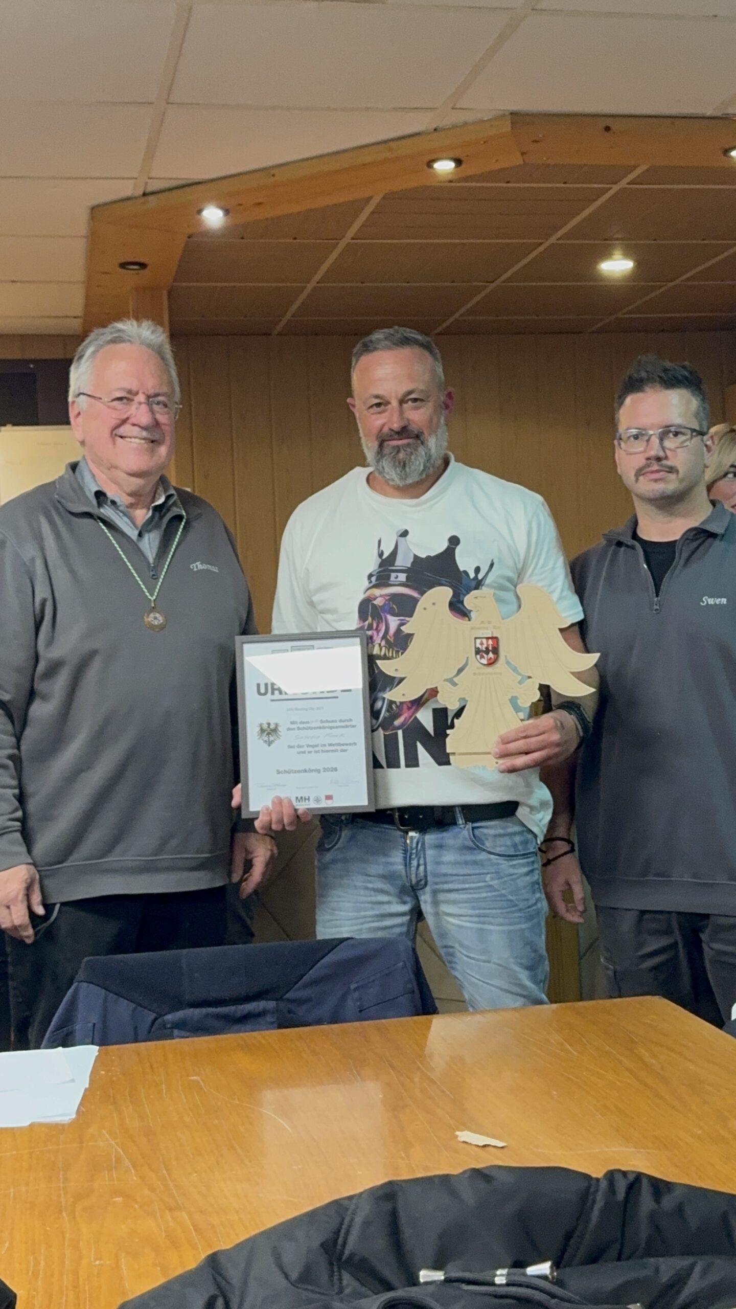 In der letzten Disziplin – zukünftiger Schützenkönig für das Jahr 2026 – hatte sich bereits im Vorfeld ein Kandidat gefunden. Sascha Funk vom im Jahr 2023 neugegründeten Schützenzug – den 5. Schill’schen Offizieren – schießt auf den Vogel, um im nächsten Schützenjahr die Schützenkönigswürde zu übernehmen. Bereits mit dem 40. Schuss fiel der Vogel und somit stand der neue Schützenkönig fest.